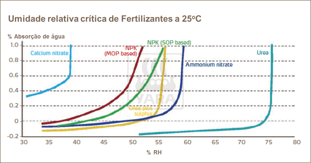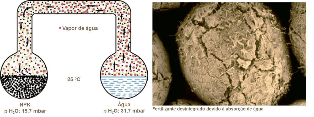 Todos os fertilizantes são mais ou menos higroscópicos, o que significa que começam a absorver umidade a uma umidade específica ou a uma certa pressão de vapor d'água. Alguns fertilizantes muito higroscópicos atraem umidade com mais facilidade e a uma umidade mais baixa que outros. A absorção de água ocorre se a pressão do vapor d'água do ar exceder a pressão do vapor d'água do fertilizante.