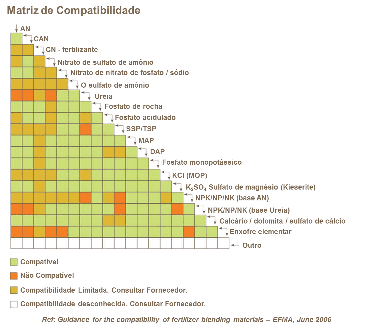 A compatibilidade está relacionada principalmente à mistura de diferentes fertilizantes, contaminação cruzada e outros problemas de segurança e/ou qualidade, por exemplo, empedramento, enfraquecimento (perda de dureza), formação de poeira e perda de resistência à decomposição térmica no caso do nitrato de amônio.