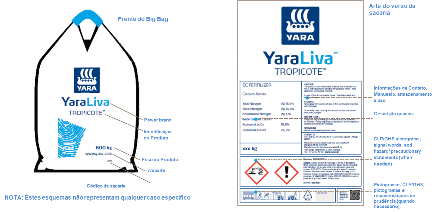 A origem do produto sempre está escrita no saco. A parte frontal tanto dos big bags quanto das embalagens menores (25 ou 50 kg) está rotulada para o transporte, rótulo TDG. A parte de trás tanto dos sacos grandes quanto dos pequenos geralmente está rotulada de acordo com os Regulamentos CLP e TDG.